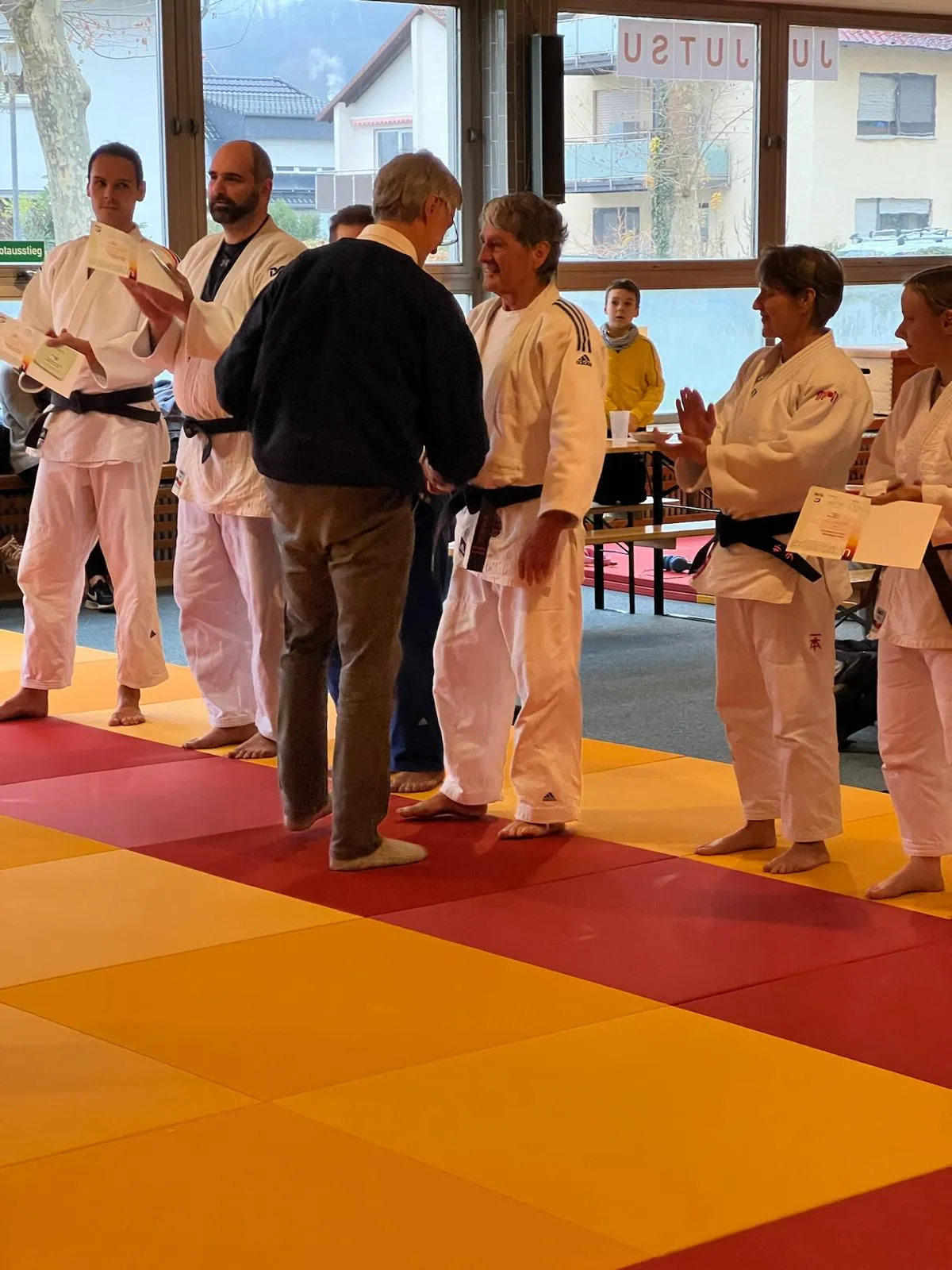 Dabei besonders herauszustellen sind die hervorragenden, technischen Leistungen von Dominik Riedel und Michael Matt zum 2. Dan sowie die Graduierung von Hans Poth zum 3. Dan, der mit 76 Jahren alle Anforderungen bravourös meisterte.