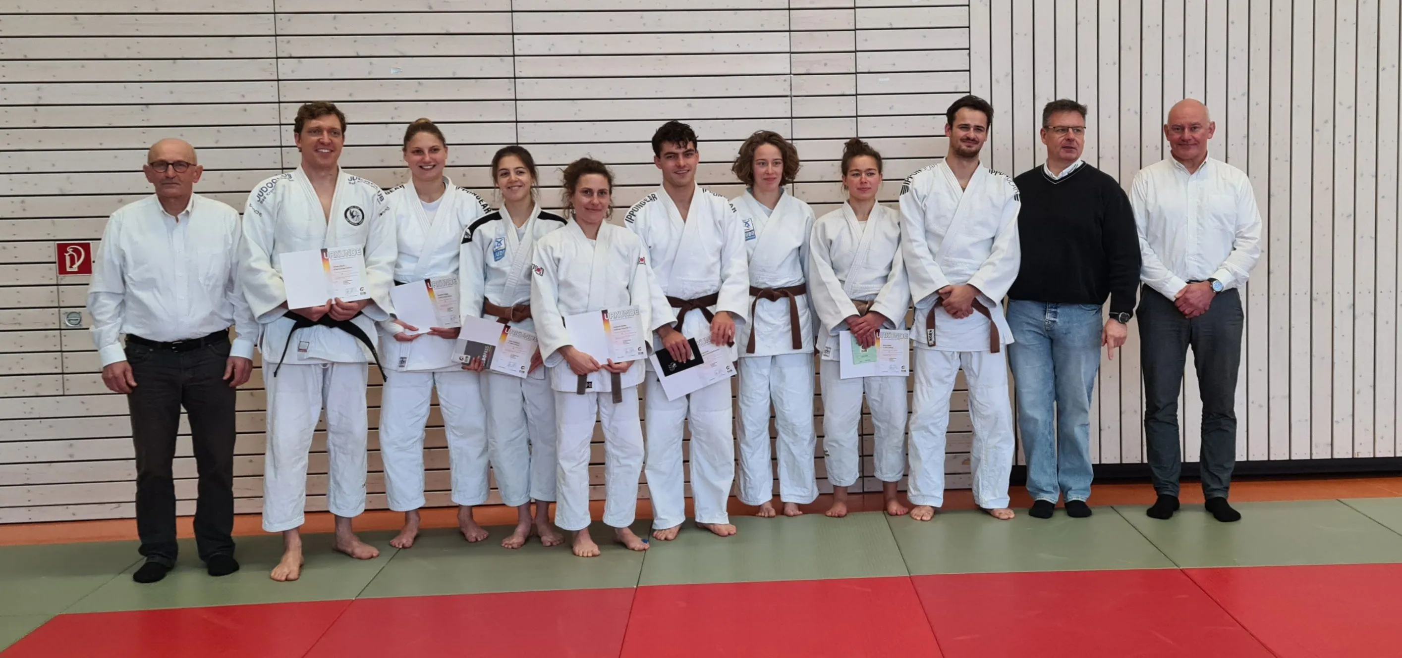 Christina Daiger und Simon Rösch (JC Bad Krozingen) zum 2. Dan. Rhea Pöter, Julia Holstein (beide FT 1844 Freiburg), Nico Burkard (JC Pfaffenweiler), Franka Detemple (TV Bruchhausen) und Steffi Eichler (Freiburger JC) zur erfolgreichen Graduierung zum 1. Dan. Roman Soljankin (JC Bad Krozingen) konnte mit guten Leistungen als Tori und Uke die technischen Modulanforderungen abschließen.