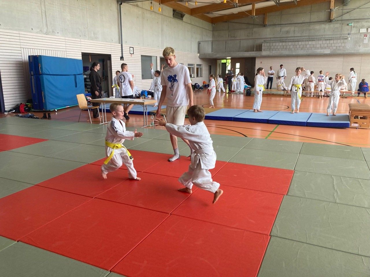 Am Samstag Nachmittag startete die Judo-Safari mit der traditionellen Sommer-Gürtelprüfung für Kinder und Jugendliche vor Publikum wie Eltern, Geschwister, Freunde und Verwandte. Parallel hierzu konnten die gerade nicht auf der Matte stehenden Kinder draußen an verschiedenen Stationen Spiele wie Kypp (Wikinger-Schach), Mephisto und Carrom, oder auch Fahrzeuge wie Einrad, Pedalos, Skateboards, oder Stelzenlauf ausprobieren.